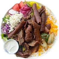 Chicken Gyro meat served with fresh pita bread, rice, salad, butter masala sauce, grill vege, and side of tzatziki sauce