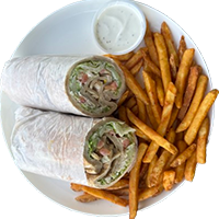 Chicken Gyro meat wrapped in friesh pita bread with onion, tomatoes, Lettuce, cucumber, feta cheese and tzatziki sauce, served with fries and a medium Soft drink