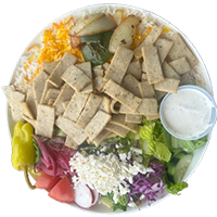 All salads are served with fresh pita bread. All salad are mad withe domaine or iceberg lettuce, cucumber, onio tomatoes, feta cheese, pepperonic served with side of house dressing.